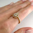 Gold ring with diamond halo and diamonds on shoulders. 0.72ct round brilliant cut diamonds set in 18ct yellow gold