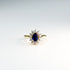 0.83ct oval cut blue sapphire centre stone complemented with 0.46ct diamond halo and set in 18ct yellow gold