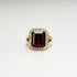 11ct octagon cut garnet centre stone set in 18ct yellow gold and complemented with 0.40ct diamond halo