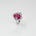 3.23ct pink oval cut ruby centre stone complemented with 0.60ct diamond halo and set in 18ct white gold