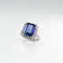 6.91ct emerald cut blue sapphire centre stone complemented with 1.04ct diamond halo and set in platinum