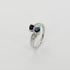 A combination of two trillion cut blue sapphires, totaling 0.50ct, is complemented by 0.35ct of baguette cut diamonds and set in 14ct white gold.