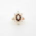 This beautiful 9ct rose gold ring features 0.60ct oval opals and round garnets set in an exquisite flower cluster. With a total weight of 5g, it is a stunning addition to any jewelry collection.
