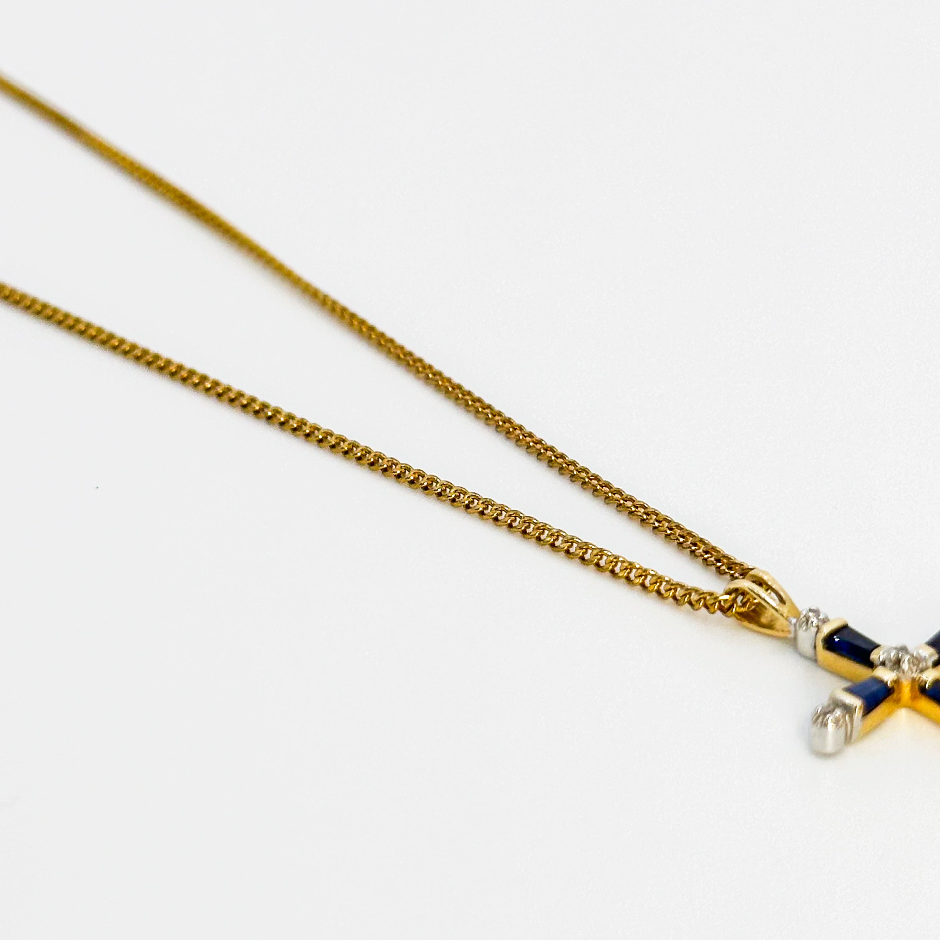 This 9ct vintage yellow gold cross is adorned with sapphires and diamonds and comes with an 18 inch chain. It has a total weight of 2.4g.